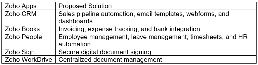 • Cost Savings: Consolidated licensing under Zoho One reduced software costs