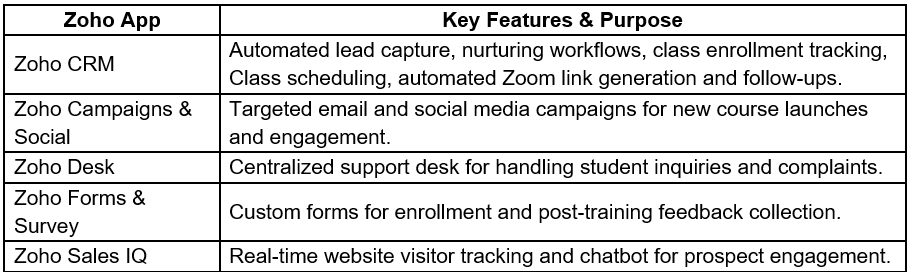 ITEG’s experts determined that a combination of Zoho CRM, Zoho Bookings, and Zoho Campaigns, supported by Zoho Desk and Sales IQ, would automate the full student lifecycle—from inquiry to certification.