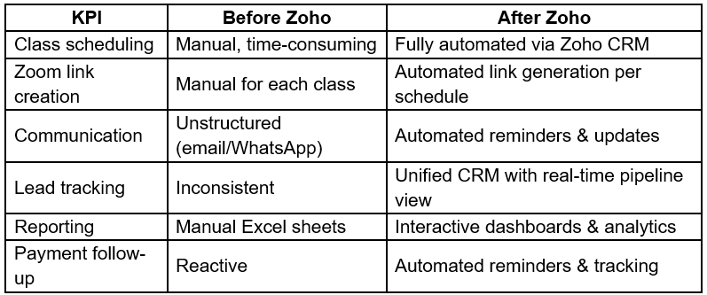 The Zoho One implementation brought measurable improvements to YouExcel’s business operations: